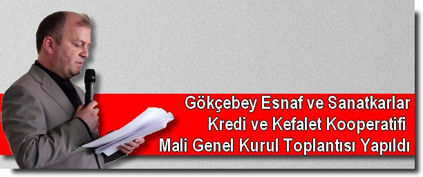 Genel Kurul’u 20.03.2012 Salı günü Camlı köşk sosyal tesisinde saat 13.00’de Bilim ve Sanayi teknoloji bakanlığı temsilcileri Serpil Özlen ve Birol Cangi gözetiminde yapıldı. Gökçebey Esnaf ve Sanatkarlar Kredi ve Kefalet Kooperatifi başkanı Ali Çetin tarafından açılan genel kurul toplantısı Saygı duruşu ve istiklal marşı’nın okunmasıyla başladı. Genel kurul başkanlığına Mehmet Azman Başkan vekilliğine Adnan Keklikoğlu, Yazmanlıklara Mehmet Cüre ve Hayri Kandemir seçildiler. Daha sonra Yönetim kurulu faaliyet raporu, Bilanço, Gelir gider tabloları ve Denetim kurulu faaliyet raporu sırasıyla okunarak oylandı. Yönetim kurulu üyeleri seçimine geçildi mevcut Başkan Ali Çetin tek listeyle tekrar Başkan seçildi. Asil: Ali Çetin, İsmail Bayoğlu ve Akın Etçibaşı. Yedek: Ergin Adabaş, Nemci Pazar ve Şaban Kara.