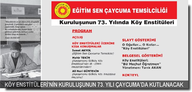 Eğitim Sen Çaycuma Temsilciliği tarafından, Köy Enstitüleri’nin kuruluşunun 73. yılı Çaycuma’da kutlanacak.
