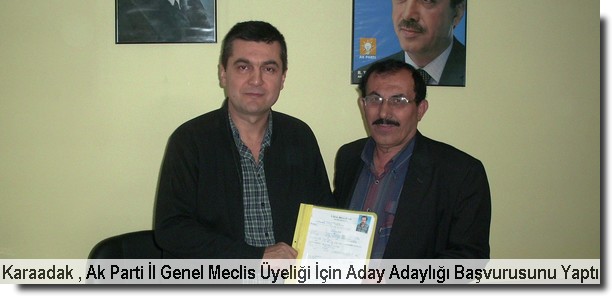 Tahir Karaadak AK Parti’den Gökçebey il genel meclis üyeliği aday adaylığı için resmi başvurusunu yaptı.2014 Mart yerel seçimlerinde de Ak Parti’den il genel meclisi için resmi başvurular yapılmaya başlandı. AK Parti’ye il genel meclis üyeliği aday adaylığı için başvuru yapan Karaadak seçilmesi halinde Gökçebey’in sorunlarına çare bulmak için çalışacağını ifade etti.