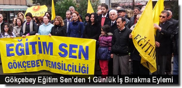 Eğitim sen Gökçebey temsilcisi Servet Büyükkol eyleme katılanlara teşekkür etti. Ardından Eğitim sen Gökçebey ilçe yönetim kurulu üyesi Mehtap Özüdoğru hazırlanan basın bildirisini okudu. Basın bildiri okunurken katılımcılar zaman zaman sloganlar attılar. Okunan bildiride hükümeti ve eğitim alanında alınan kararları eleştiren Özüdoğru ‘’ TBMM gündeminde olan mevcut tasarı ile; dershanelerin dönüştürülmesi bahanesiyle öğrenci başına devlet desteği adı altında kamu kaynakları özel okullara aktarılmakta, devlete ait arazi ve okul binalarının özel sektöre ve kuvvetle muhtemel hükümetle bağlantılı kimi vakıf ve derneklere devredilmesi ya da kiralanmasının hesapları yapılmaktadır. Yıllardır eğitime yeterli bütçe, okullara ödenek ayrılmamakta, kamu okullarında bugün hala daha temizlik vb. adlarla para toplanmakta eğitimin bütün yükü velilerin üzerine yıkılmaktadır. Meclisten hızla geçirilmek istenen bu yasa tasarısı ile ataması yapılmayan binlerce öğretmenimizi bir kez daha güvencesizliğe mahkum edilmek istenmektedir. Bin bir zorlukla eğitim fakültelerinden mezun olan öğretmenlere KPSS yetmezmiş gibi, şimdi de yeni bir sınav getirilmek istenmektedir, iktidar öğretmen alımlarında ve yönetici atamalarında bile kendinden olmayana tahammül edememekte, kendisine koşulsuz itaat edecek insanlarla çalışmak istemektedir.’’dedi.