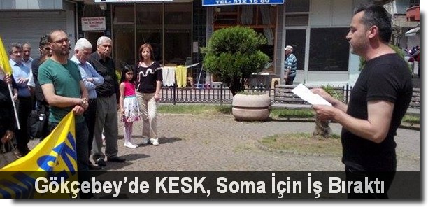 Soma için grev yapan KESK Gökçebey Bileşenleri ilçe merkezi Cumhuriyet Meydanı Atatürk büstü önünde basın açıklaması yaptı. KESK Gökçebey Bileşenleri adına basın açıklamasını okuyan Eğitim Sen Gökçebey Temsilcilisi Bahri Çetinoğlu şunları söyledi” Manisa'nın Soma ilçesinde özelleştirilen Soma Maden İşletmeleri AŞ. ‘ne ait maden ocağında meydana gelen patlamada resmi açıklamalara göre şu ana kadar en az 205 işçi kardeşimiz yaşamını kaybetti, yüzlerce işçi kardeşimiz yaralandı, yüzlercesi yeraltında kurtarılmayı bekliyor. KESK olarak hayatını kaybeden işçilerin ailelerine başsağlığı, yakınlarına sabırlar diliyoruz.