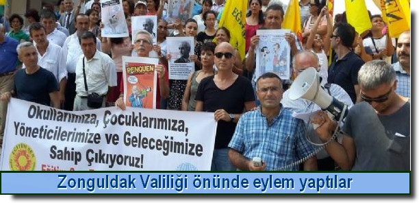 Eğitim Sen Zonguldak Şubesi üyeleri, Zonguldak Valilik binası önündeki eylemde müdür atamalarına, Temel Öğretimden Orta Öğretime Geçiş (TEOG) sınavı yerleştirme sonuçlarına, okul dönüşümlerine, öğretmenlere getirilen rotasyona, aday öğretmenlere yönelik sözlü sınav uygulamasına, kamu Kaynaklarının özel okullara aktarılmasına, Okulöncesi eğitim kurumlarında tam gün eğitimden vazgeçilmesine karşı basın açıklamasıyla tepki gösterdi.