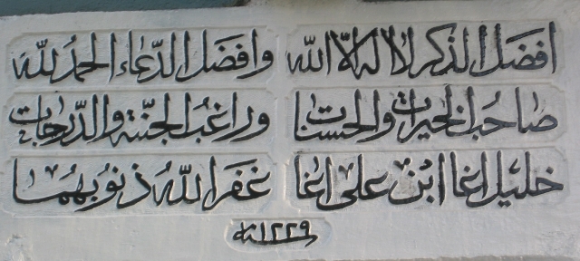 Okunuşu; Zikrin Faziletlisi Lailahe illallah duanın faziletlisi Elhamdulillah hayrın ve iyiliğin sahibi üstün derecelere ve cennete rağbet eden (isteyen) Ali Ağa oğlu Halil Ağa Allah onu günahlarını affetsin sene 1229 (1813)