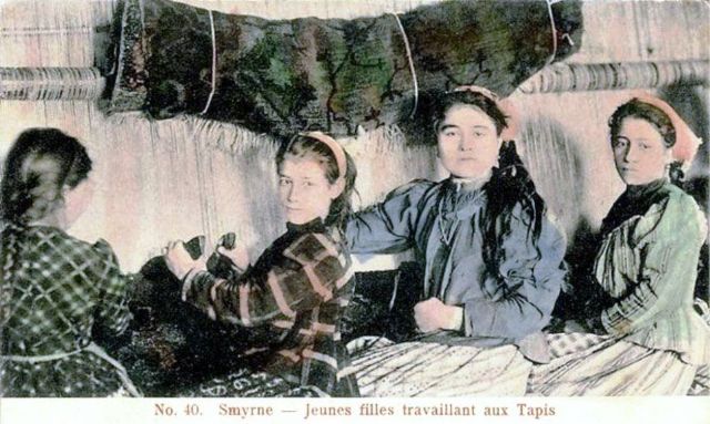 (19. yüzyılın sonlarında Isparta’da halı dokumacıları. Şark Halı Kumpanyası’nın bir kartpostalından)