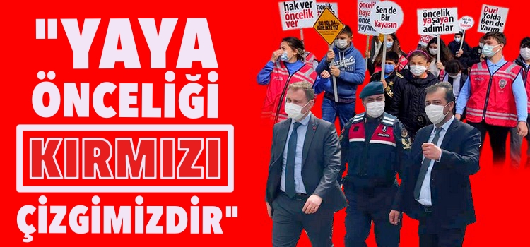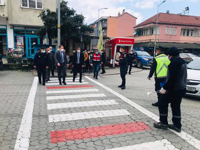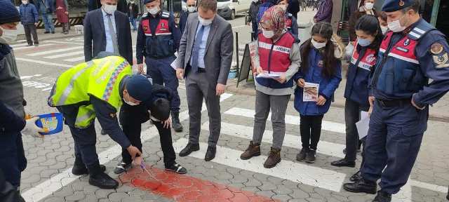 Kaymakam Koşansu ve protokol önce yaya geçidinde bulunan beyaz şeritlerden birini kırmızıya boyayarak "Yaya Önceliği Kırmızı Çizgimizdir" vurgusu yaptı. Sonrasında Kaymakam Koşansu ve protokol yaya geçidinden öğrencilerle birlikte geçerek yaya geçidinin kullanılması anlamında vatandaşlara örnek oldu.