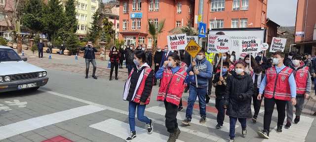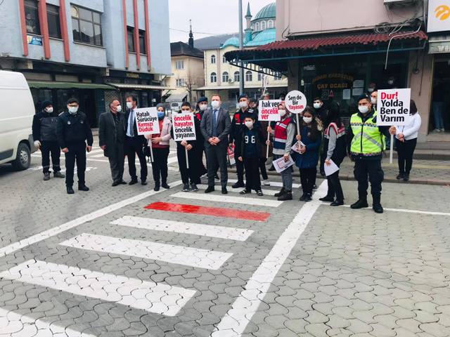 Etkinliğe katılan öğrenciler ise ellerindeki "Yaya yolu benim yolum", "Sende bir yayasın", "Dur yolda bende varım" ve "Hak ver Öncelik ver" yazılı pankartlarla sürücülere uyarıda bulundu.