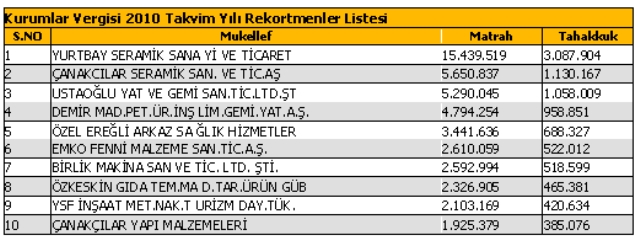 Zonguldak’ta en yüksek kurumlar vergisi bayan eden 100 mükellef belli oldu.Vergi Dairesi Başkanı Hüseyin Bayar yaptığı açıklamada, “2009 vergilendirme dönemi yıllık kurumlar vergisi beyanlarına ilişkin olarak Nisan 2010 ayında mükelleflerce verilen yıllık kurumlar vergisi beyannamelerinin değerlendirilmesi sonucunda; Zonguldak ilinde en yüksek beyanda bulunan ilk 100 mükellefler belli olmuştur.