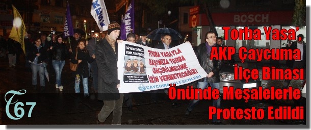 KESK Çaycuma Bileşenleri AKP Çaycuma İlçe binası önünde TBMM Plan Bütçe Komisyonunda görüşülmeye devam eden ‘Torba Yasa’yı meşalelerle protesto etti. Sık sık ‘AKP torbanı al başına çal, İMF için değil çalışanlar için yasa’ sloganları atıldı.