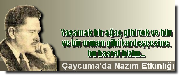 Nazım Hikmet’in Doğumunun 109.Yılında Çaycuma Kültür ve Sanat Evin'den Anma Etkinliği düzenlenecek. Dünyaca ünlü şairimiz Nazım Hikmet, doğumunun 109.yılında etkinlikle anılıyor. Çaycuma Kültür ve Sanat Evi’nin düzenlediği anma etkinliği, şairin doğum günü olan 15 Ocak 2011 Cumartesi günü Çaycuma Ticaret ve Sanayi Odası salonunda gerçekleştirilecek. Çaycuma Kültür ve Sanat evi mensuplarının hazırladıkları anma etkinliğinde; Şairin yaşamı kronolojik olarak sunulurken, şiirleri bu kronolojiye uygun olarak seslendirilecek, döneme uygun slayt gösterisi yapılacak. Ücretsiz olan anma etkinliği, Nazım Hikmet’in şiirlerinden bestelenen şarkılarla sona erecek.