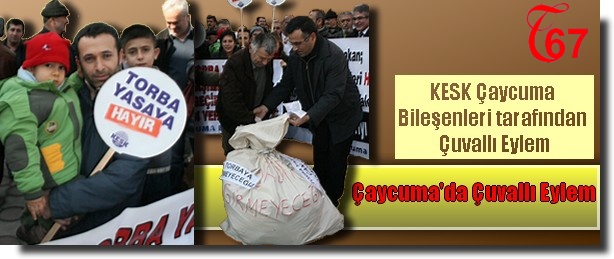 KESK Çaycuma Bileşenleri tarafından TBBM2de görüşülmesine devam eden torba yasaya karşı çuvallı eylem gerçekleştirildi. Çarşı Meydanında büyük bir çuvalla gerçekleştirilen eyleme KESK üyelerinin yanı sıra CHP Çaycuma İlçe Başkanı Şeref Köktürk ile vatandaşlar katıldı. Eylem için hazırlanan çuvaldan orada bulunan vatandaşlara kağıt çektirilerek, Mecliste görüşülen torba yasa içinde yer alan ve çalışanların, halkın aleyhine olan maddeler tek tek okutturuldu.
