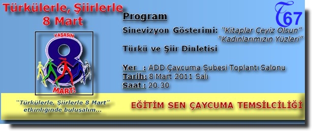 Eğitim Sen Çaycuma Temsilciliği Eğitim Sekreteri Mahir Akşan tarafından yapılan açıklamada, 8 Mart Dünya Emekçi Kadınlar Günü’nün, 8 Mart 2011 Salı günü saat 20.30’da ADD Çaycuma Şubesi Toplantı Salonu’nda “Türkülerle, Şiirlerle 8 Mart” etkinliğiyle kutlanacağı belirtildi.