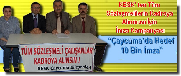 Güvencesiz çalışmanın ortadan kaldırılması, 4/B, 4/C, 50/D, 4924 statüsünde çalışan tüm sözleşmelilerin kadroya alınması, taşeron işçilerinin “ana işveren olan kurum” kadrolarına alınması, insan onuruna yakışır iş ve çalışma şartları için başlatılan kampanyanın Çaycuma ayağı, KESK Çaycuma Bileşenleri tarafından Eğitim Sen Çaycuma Temsilciliği binasında yapılan basın toplantısıyla Çaycuma kamuoyuna açıklandı.